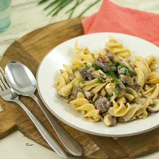 Verhit de olijfolie in een wok of hapjespan en fruit de knoflook, ui en rode peper 2 minuten. Voeg de champignons toe en bak 4 minuten op middelhoog vuur. Zet het vuur laag, voeg de pasta, de room en parmezaanse kaas toe en verwarm nog 1 minuut. Breng op smaak met peper en zout en garneer met de bieslook.